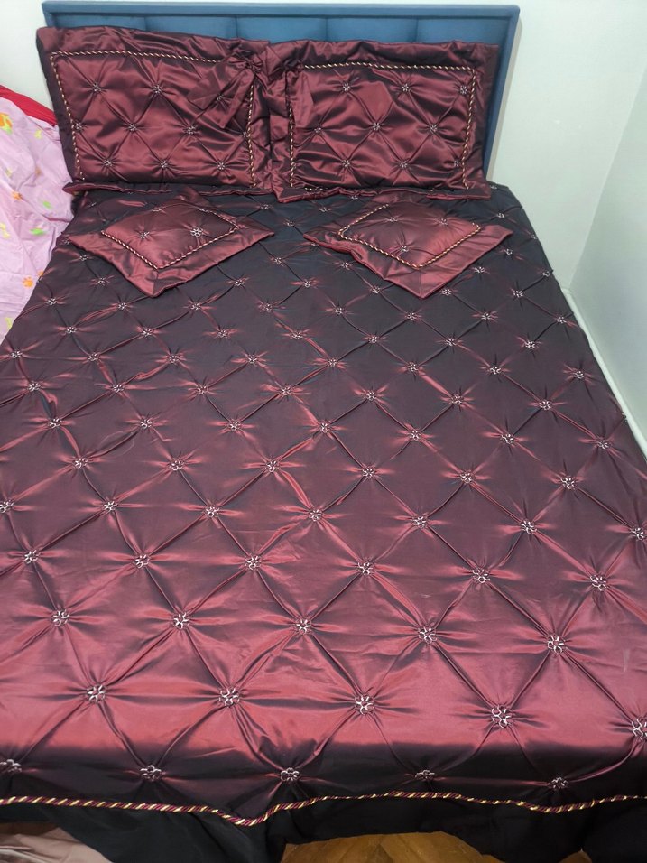 Nakışlı desenli, bordo renkli koyu tonlarda yatak örtüsü ve uyumlu yastık kılıfları, şık dokulu tasarım. 1,2 kere kullanıldı sıfır gibi kutulu 2 yastık 2 küçük yastık