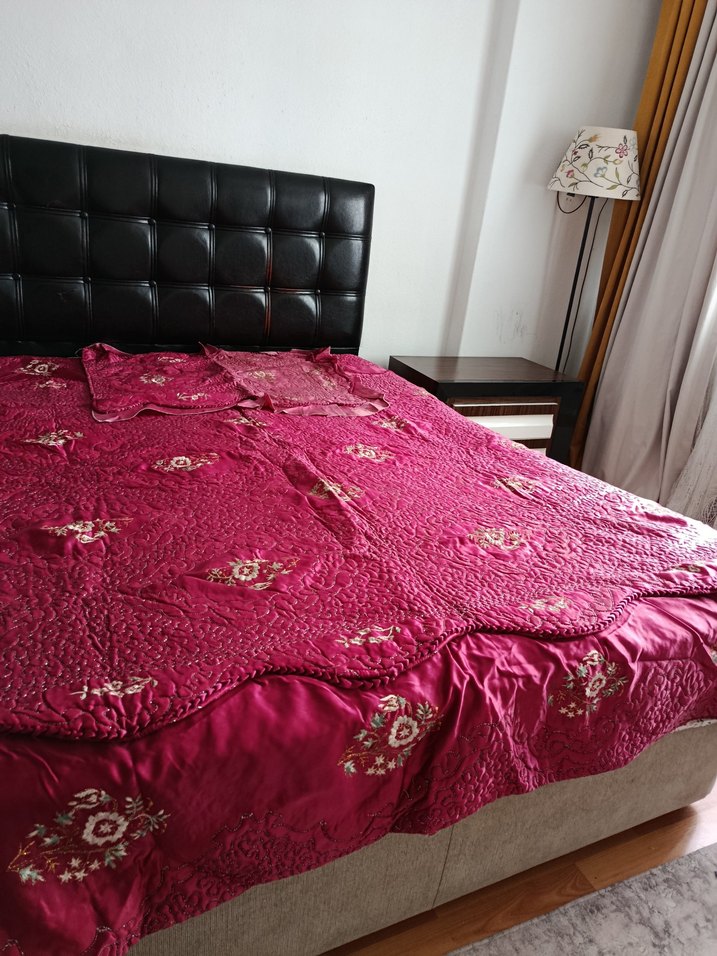 Bordo renkli yatak örtüsü, koyu tonlarda ve detaylı nakışlı desenlere sahiptir, yatak odasına zengin bir doku katar. uzunluk 220 genişlik 200 1adet yastık kılıfı var