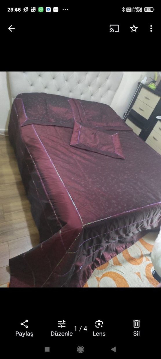 Koyu bordo renkli, nakış desenli yatak örtüsü, yatak odasına şık bir dokunuş katıyor. ️ Battal boy temiz