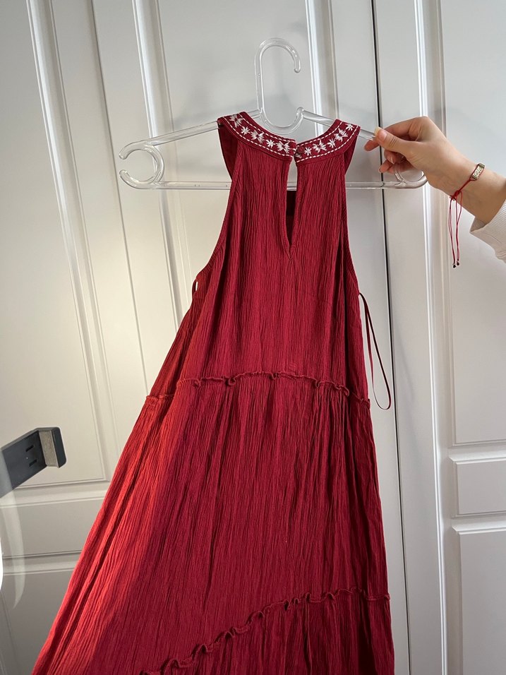 Bordo renkli, yüksek yakalı ve nakış detaylı uzun keten elbise. İnce askılı, bol kesim ve dökümlü tasarıma sahip, romantik akşamlar için ideal.