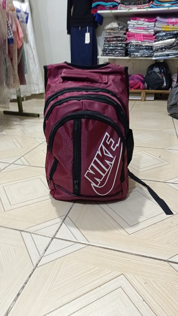 Bordo renkli Nike sırt çantası, çoklu fermuarlı bölmeler ve baskılı logo ile sokak stili ve işlevselliği bir araya getiriyor.
