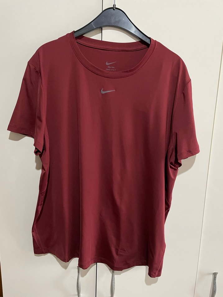 Koyu kırmızı Nike kadın tişörtü, kısa kollu ve yuvarlak yakalıdır. Rahat kesimi ve ipeksi dokusuyla spor ve günlük kullanıma uygundur.