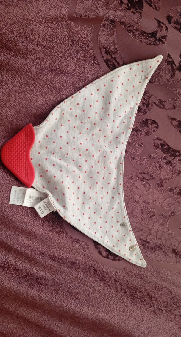 Gri zemin üzerine bordo noktalı, kırmızı diş kaşıyıcı köşesi olan bebek önlüğü. Kolay kullanım için çıtçıtlı kapanış sağlar.