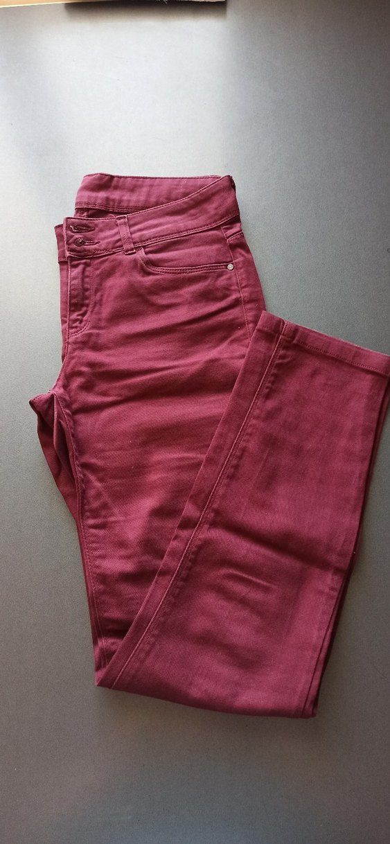 Bordo renkli, normal boy ve regular fit kesime sahip kadın keten kot pantolon, ipeksi dokusuyla günlük kullanıma uygun şık bir görünüme sahiptir. ✨