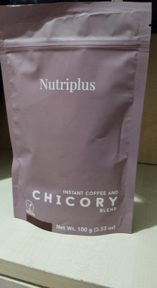 Bordo renkli Nutriplus paketi, 100 gramlık instant kahve ve hindiba karışımı içerir. Tazeliği koruyan kilitli yapıya sahiptir. ☕