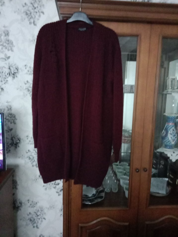 Bordo renkli, yumuşak yün kumaştan örülmüş, normal boy midi hırka. Salaş kesim ve yuvarlak yaka, uzun kollu, günlük kullanıma uygun.