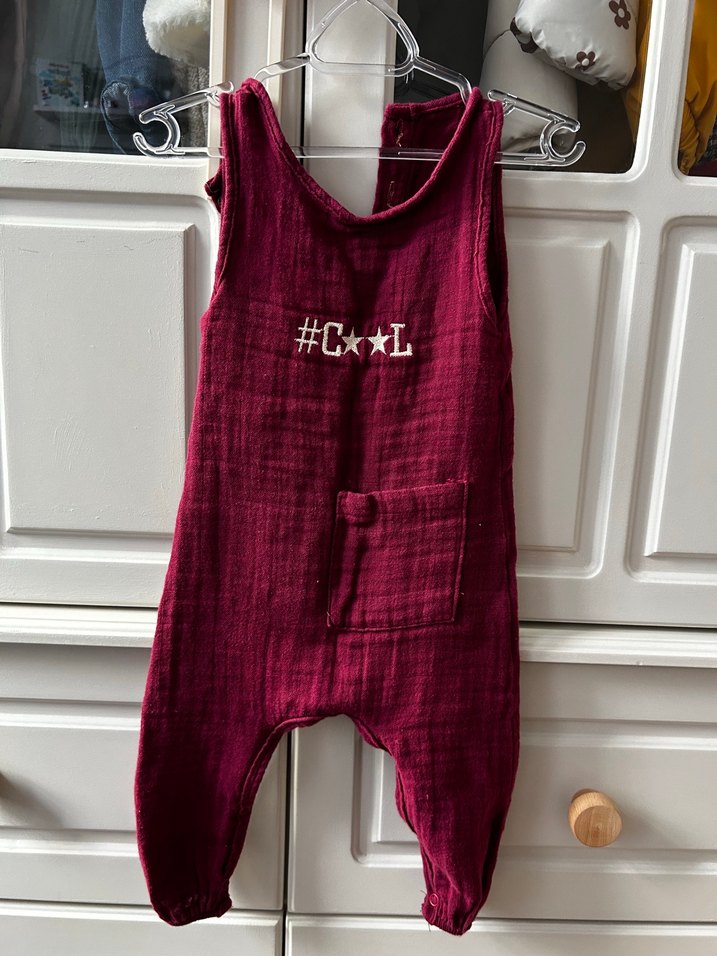 Bordo renkli, örgü dokulu bebek kız tulumu, önünde küçük cep ve göğüste '#C★L' yazısı bulunur. Desensiz ve koyu renklidir. 6-9 ay keten müslin kumaş