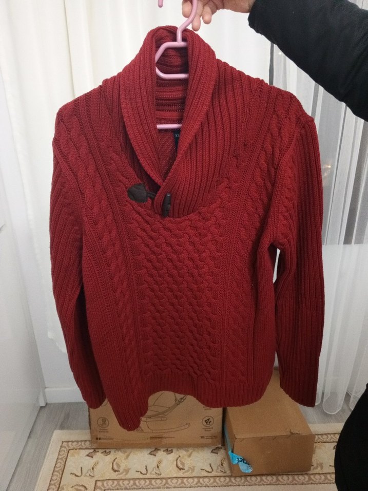 Bordo renkli, örgü desenli uzun kollu, boğazlı ve bol kesim erkek kazak. Günlük rahat stil için uygundur.
