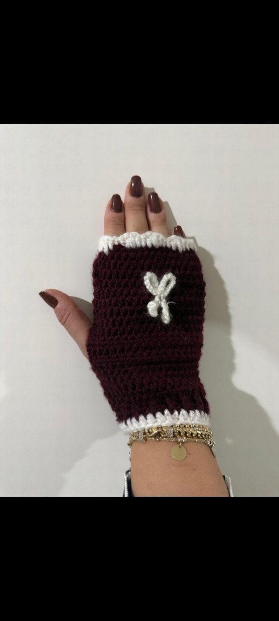 Beyaz kenarlıklı ve dekoratif fiyonk detaylı bordo örgü kadın eldiveni, rahat bohem tarzı sunar. Retro görünüme uygundur.