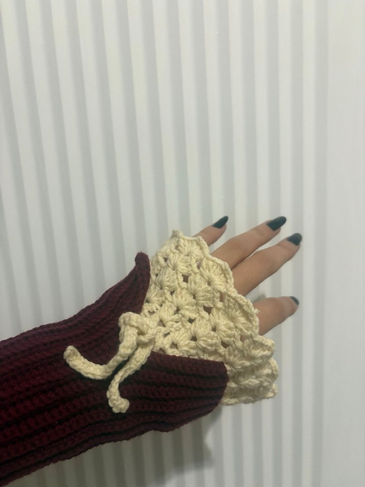 Bordo renkli, krem örgü detaylı bohem tarzda kadın eldiveni, rahat ve retro bir görünüm sağlar. İstediğiniz renk ve ölçüde yapılır. Bilek ölçüsü ve istediğiniz uzunluğu söylemeniz yeterli