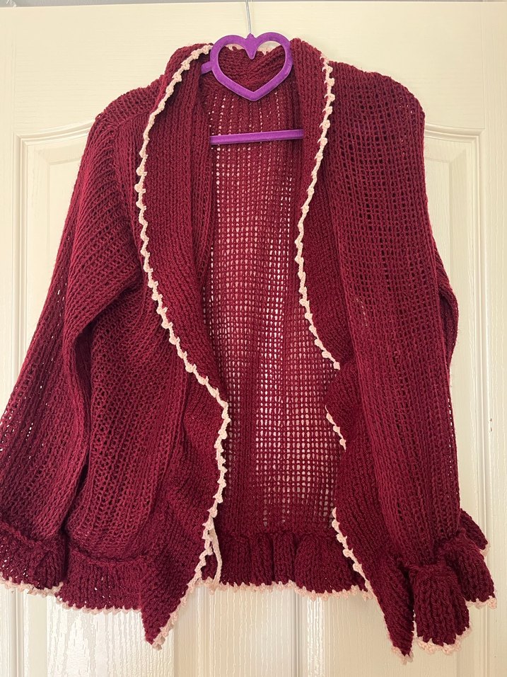 Bordo renkli, örgü kumaştan yapılmış, notlu yaka ve uzun kollu bohem tarzda bol kesim bir kadın hırkasıdır. Midi boyu ve parlak dokusuyla günlük kullanıma uygundur.