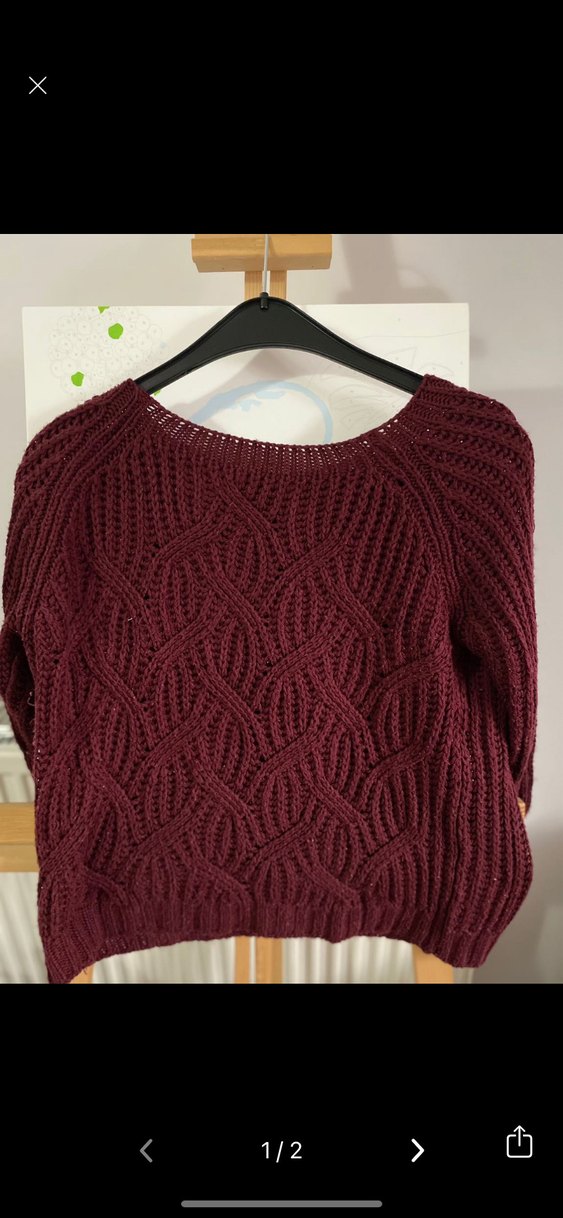 Bordo renkli, örgü dokulu, bol kesim ve yuvarlak yaka kadın kazak. Rahat ve bohem tarzıyla günlük kullanıma uygundur. Biraz tiftiklenme var xs s bedene uygundur