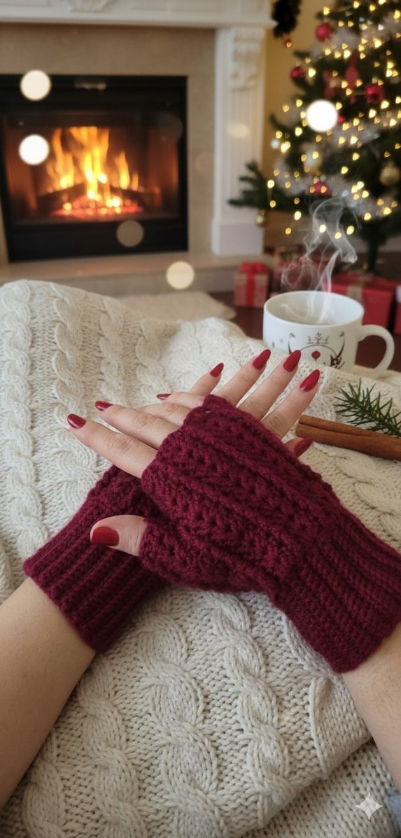 Bordo renkli, bohem tarzda örgü parmaksız eldivenler. Yumuşak örgü kumaşı ile sıcaklık ve rahatlık sağlar.