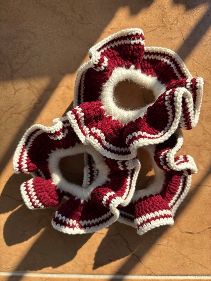 Beyaz kenarlı bordo örgü saç tokaları, renkli ve rahat bohem tarzıyla retro hippie görünüm sağlar.