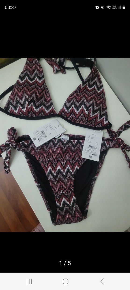 Bordo renkli, örgü dokulu ve desenli zigzag motifli, sıkı oturan bikini. Askılı üst ve yan bağlamalı alt kısmı plaj için uygun.