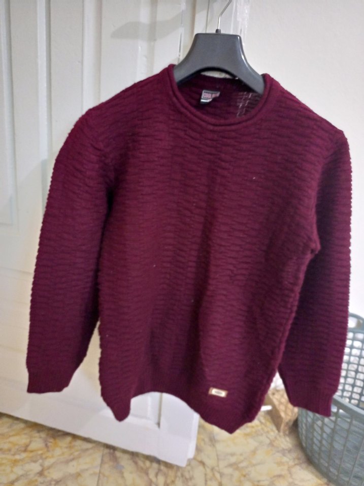 Bordo renkli, örgü erkek triko kazak, yuvarlak yaka ve uzun kolludur. Yün malzemeden yapılmış, bol kesim ve normal boydadır. Rahat ve günlük sokak stili için uygundur.