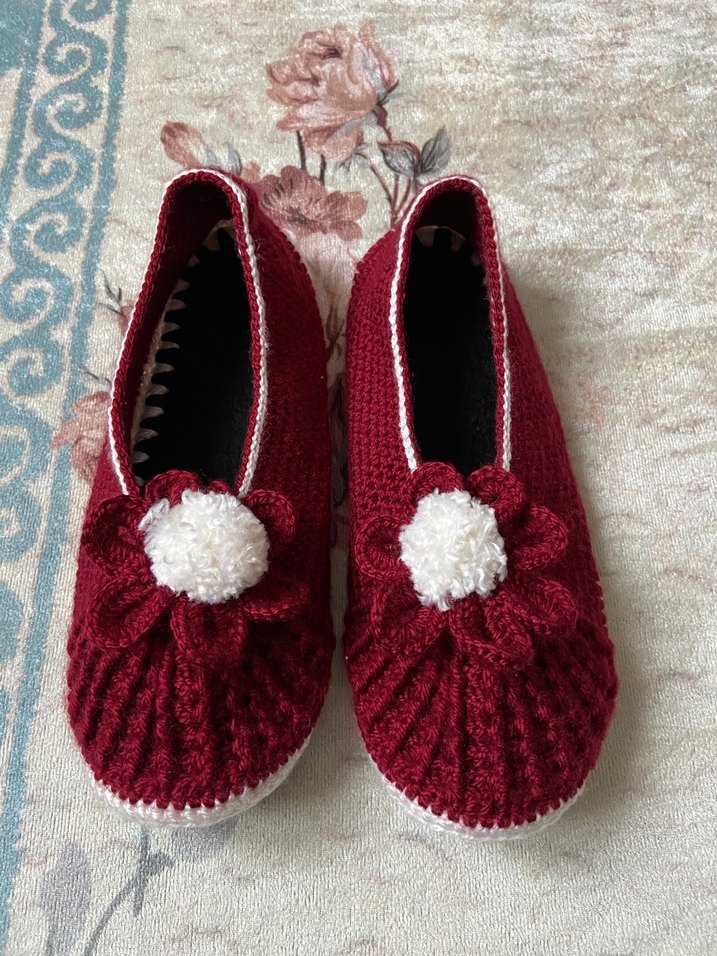 Bordo renkli, yüksek topuklu ve üstünde ponpon detaylı örgü ev terliği. Rahat ve sade tasarımlı, günlük kullanım için uygundur.