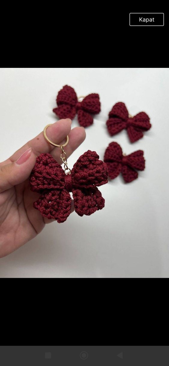 Bordo renkli, örgü fiyonk detaylı bohem tarzda kadın anahtarlık. Sade ve renkli tasarımıyla anahtarlarınıza şık bir dokunuş katıyor.