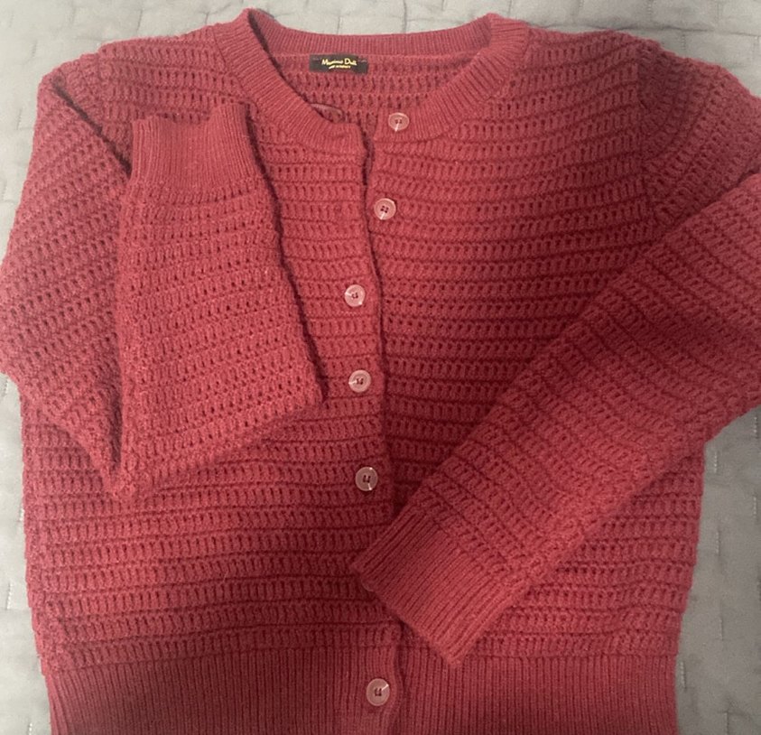 Bordo renkli, örgü hırka, yuvarlak yaka ve uzun kolludur. Rahat ve bol kesimiyle günlük kullanıma uygundur, düğmeli ve standart boydadır.