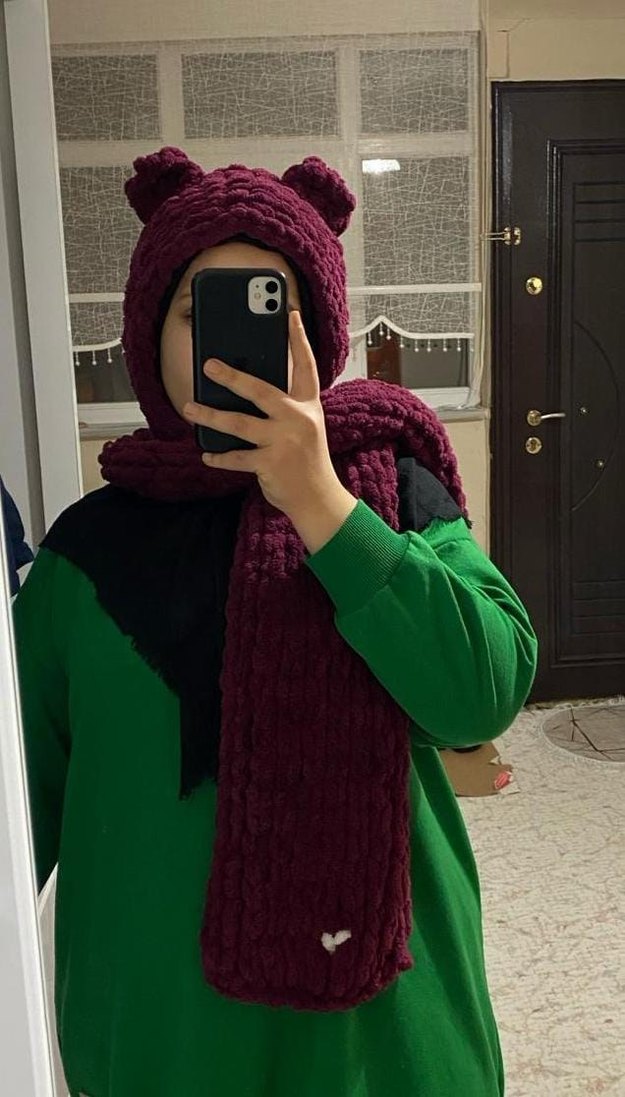 Yumuşak örgü kumaştan yapılmış, bordo renkli, rahat sokak stili örgü kadın atkı. Trendy günlük kombinlere uygun.