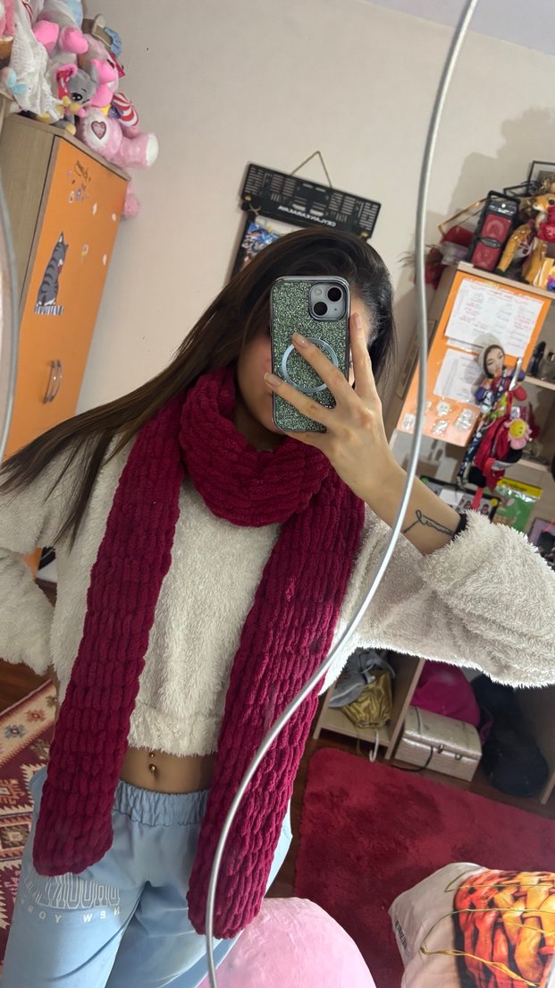 Bordo renkli, örgü kadın atkısı yumuşak dokusuyla sıcak tutar, trend sokak modasına uygundur.