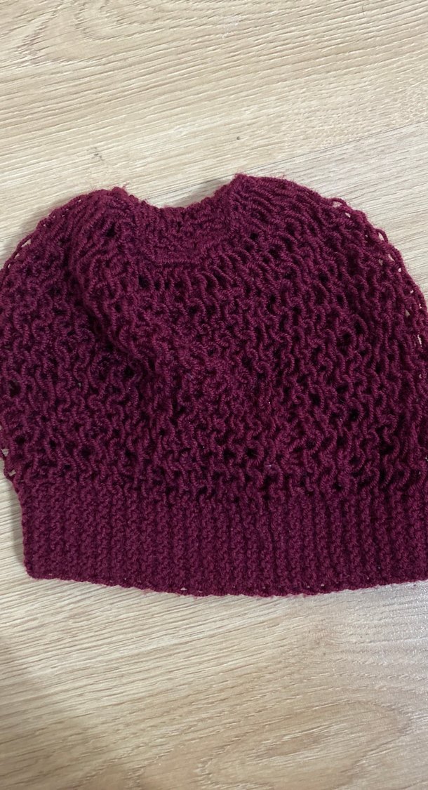 Koyu bordo renkli, örgü dokulu kadın bere, sade ve temel bohem tarzıyla rahat bir görünüm sunar.