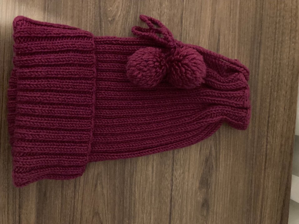 Bordo renkli, örgü kadın bere iki ponpon ile sade ve bohem tarzda, rahat bir kullanım sunar.
