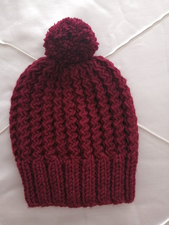 Bordo renkli, ponponlu örgü kadın bere. Rahat ve bohem tarzda, yumuşak ve sıcak tutan örgü kumaştan yapılmıştır.