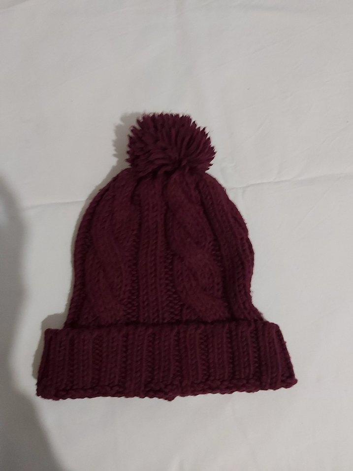 Bordo renkli örgü kadın bere, üstünde ponpon ile sıcak ve renkli bohem tarz sunar. ❄️