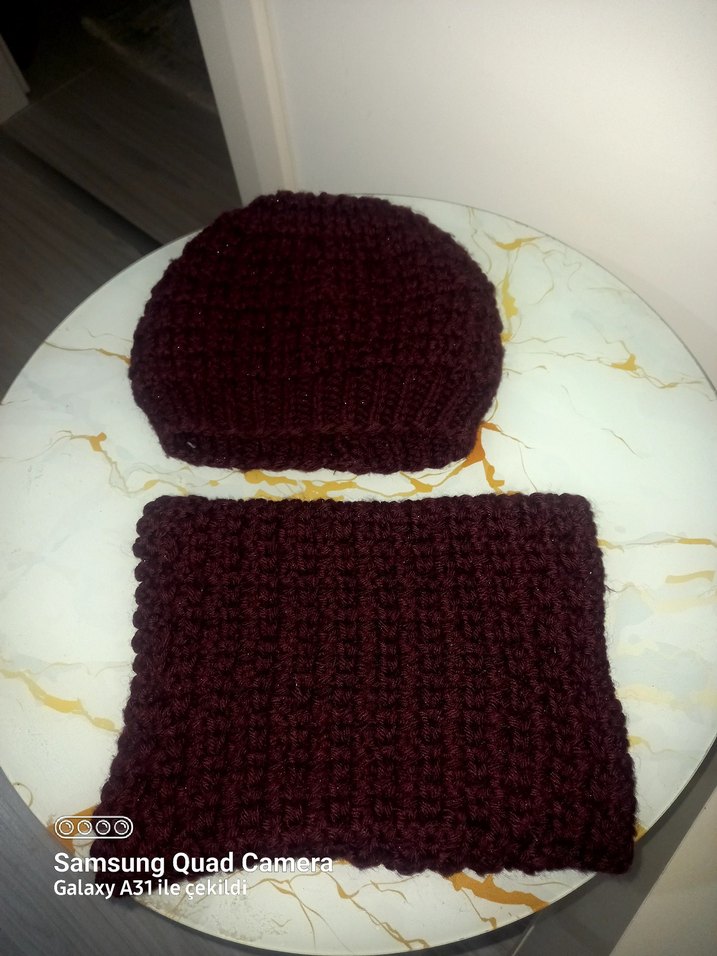 Koyu bordo renkli, örgü dokulu kadın bere ve boyunluk seti. Sıcak ve rahat, bohem tarzına uygun bir tasarım.