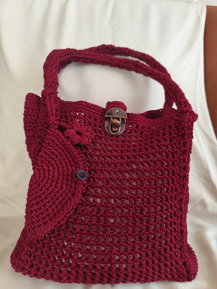 Bordo renkli, örgü dokulu kadın çanta, çiçek detaylı ve kilitli kapaklıdır. Günlük kullanıma uygundur. Siparişe göre renk ve model belirlenir.