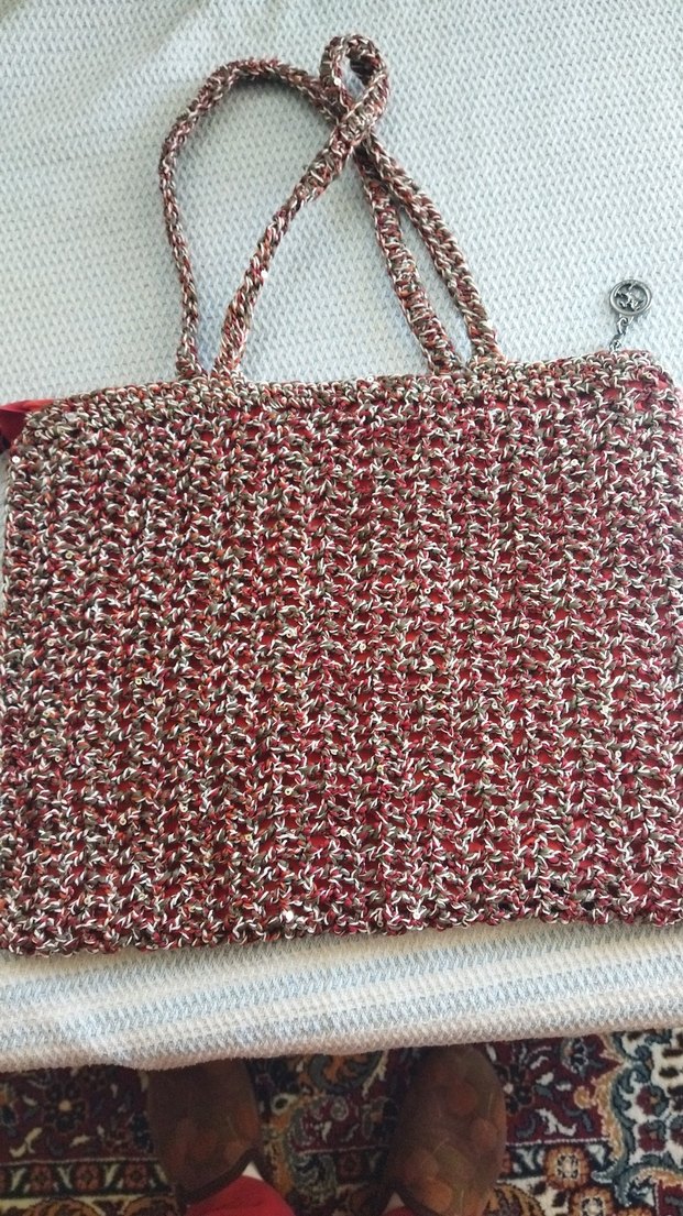 Bordo örgü çanta astarlı ve fermuarlı sade desensiz, örgü dokulu kadın çantası. Rahat kullanımlı, bohem tarzda ve örgülü saplara sahip.