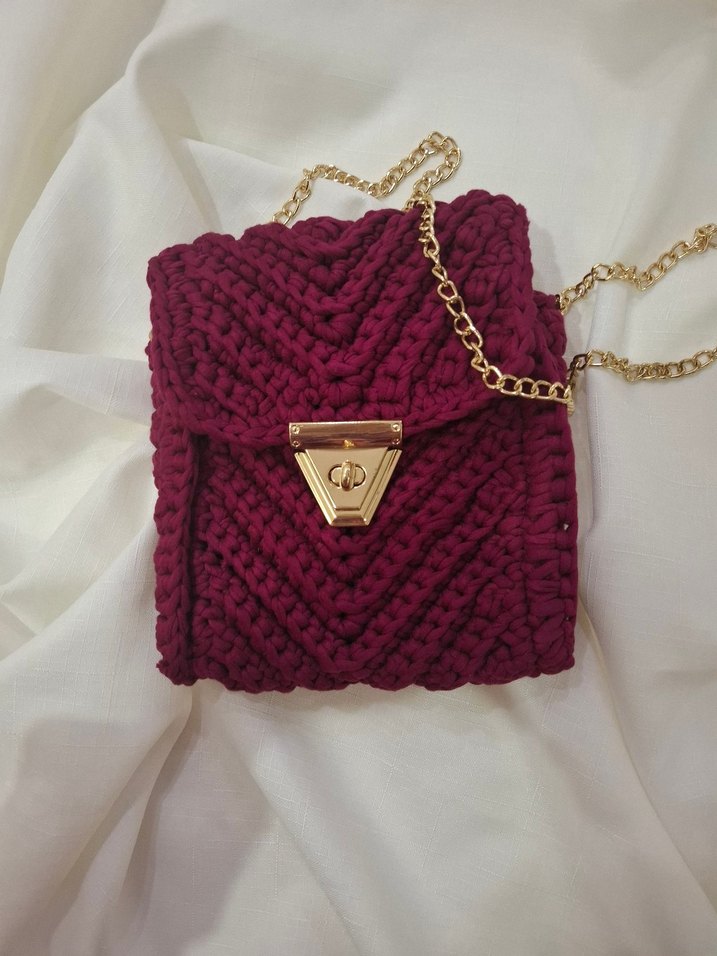 Bordo renkli örgü kadın çanta, renkli nakışlı desen ve altın zincir askıya sahip, rahat bohem tarz için uygundur.