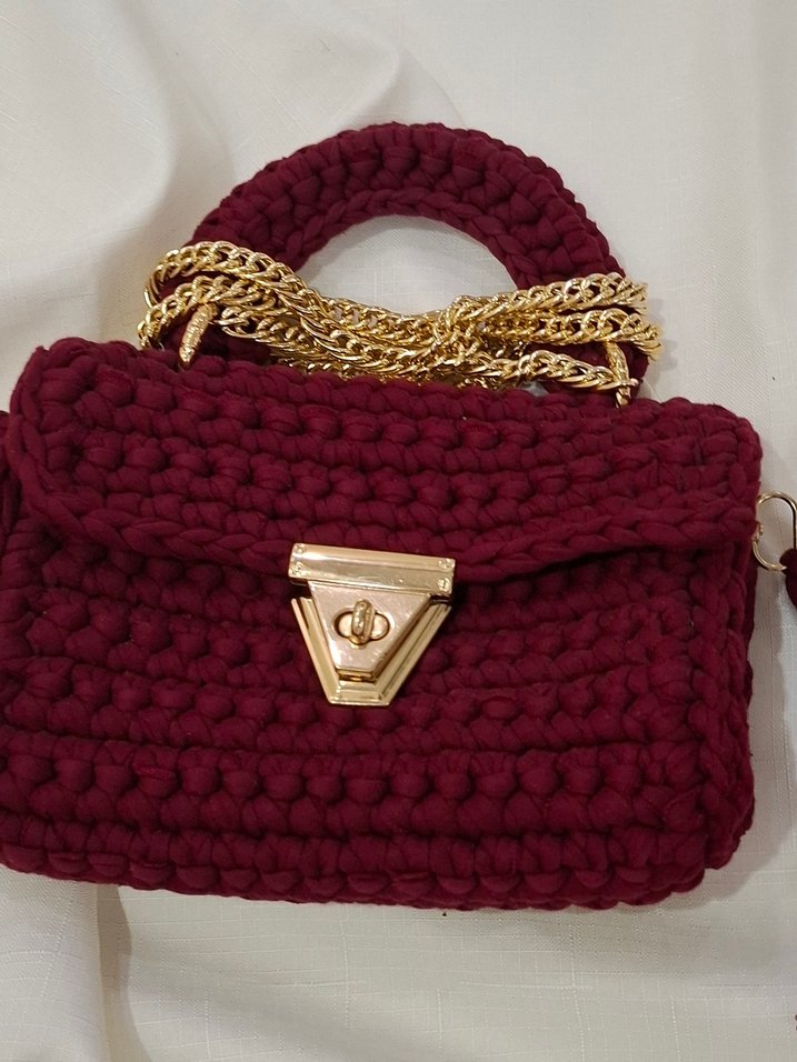 Bordo renkli, örgü dokulu bu kadın çantası, altın rengi zincir ve kilit detayıyla bohem tarzı yansıtıyor.