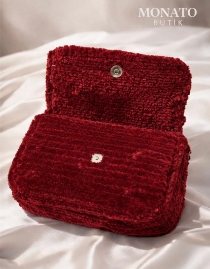 Bordo renkli, yumuşak örgü dokusuna sahip kadın çantasıdır. Parlak yüzeyi ve çıtçıtlı kapanışıyla bohem tarzı için uygundur. MONATO BUTIK etiketlidir.