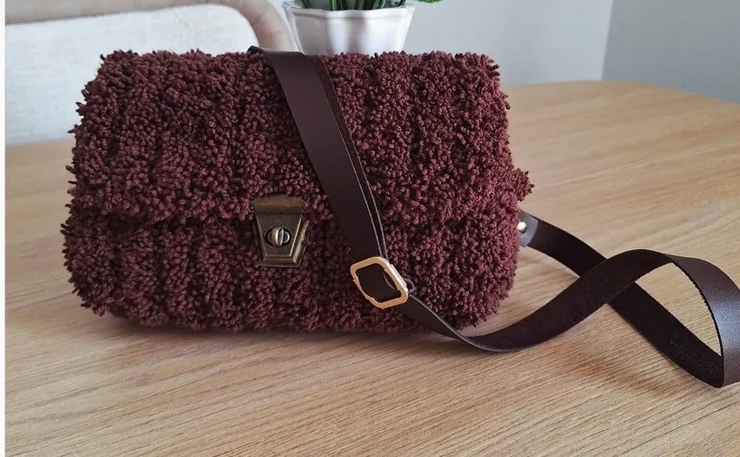 Bordo örgü kumaştan yapılmış, tokalı koyu renk askıya sahip, bohem ve retro tarzı yansıtan, desensiz rahat kadın çantası.