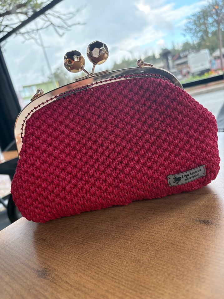 Bordo renkli, örgü dokulu kadın çantası. Renkli nakış desenli, bohem ve rahat tarzda, vintage kapanışlı, günlük kullanım için uygun.
