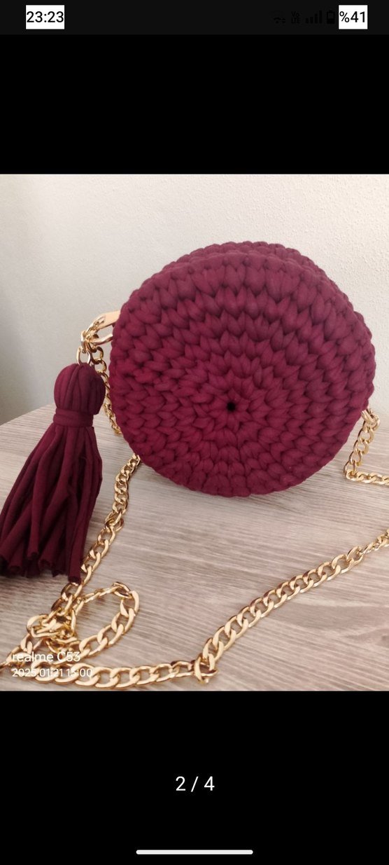 Bordo örgü kadın çanta, yuvarlak şekilli ve işlemeli desene sahip. Püskül detayı ve altın zincir askısı bulunuyor. Bohem tarz için uygun, günlük kullanıma ideal.