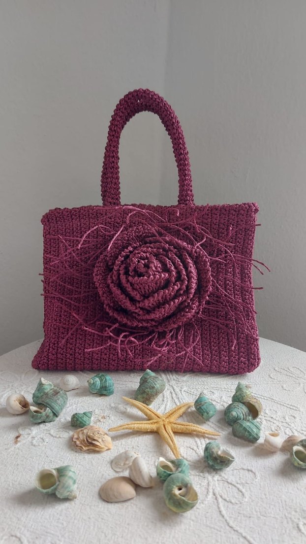 Bordo renkli örgü kadın çantası, büyük çiçek süslemeli, bohem tarzda, günlük kullanıma uygun.