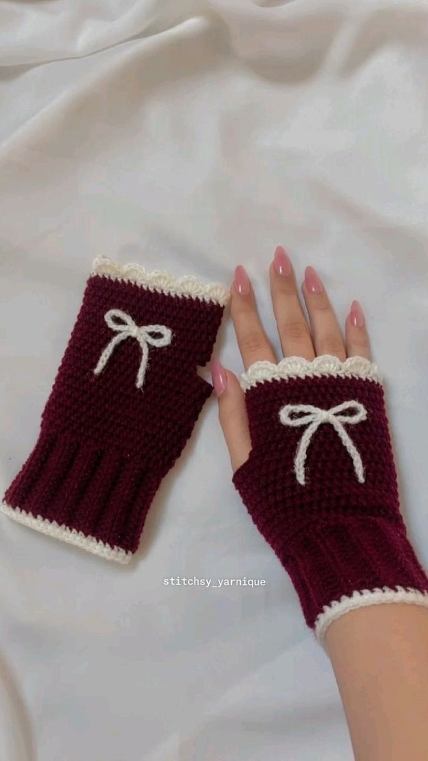 Beyaz dantel kenarları ve fiyonk detaylı bordo örgü kadın eldivenleri, rahat ve renkli gotik tarz sunar. Parmaksız tasarımı konfor sağlar.