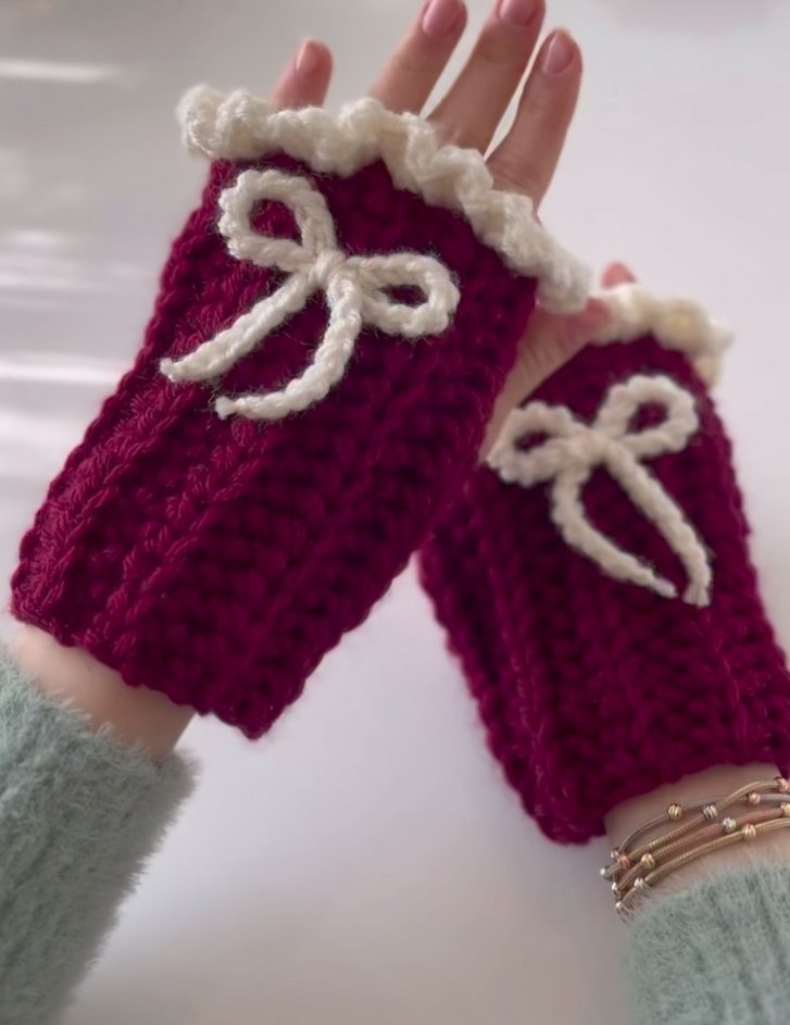 Beyaz fiyonk detaylı, yumuşak dokulu bordo örgü kadın eldiven. Renkli ve rahat bohem tarzda.