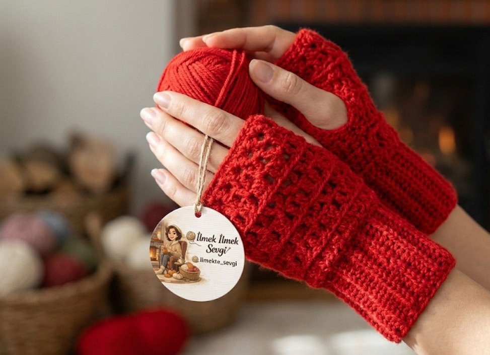 Kırmızı renkte, örgü dokuda kadın eldiveni. Sıcacık ve konforlu, bohem tarzda parmakları açık tasarım.