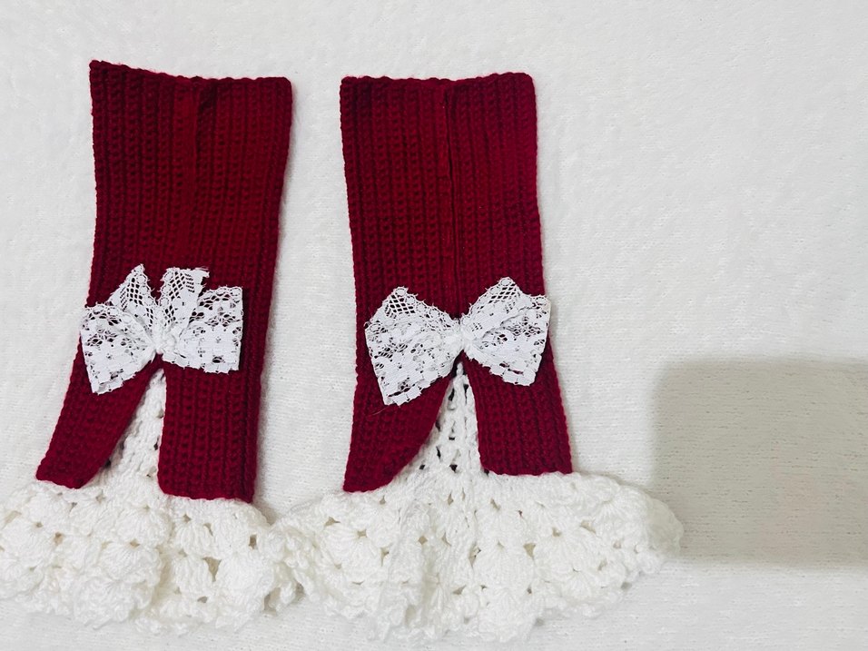 Bordo renkli örgü kadın eldivenleri, beyaz dantel fiyonklar ve fırfırlı manşetlerle bohem ve rahat bir stil sunar.