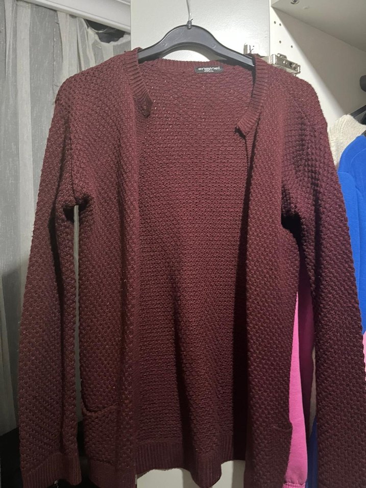 Bordo renkli, örgü dokulu, uzun kollu ve yuvarlak yakalı kadın hırka. Midi boy ve bol kesimiyle rahat ve günlük kullanıma uygundur.