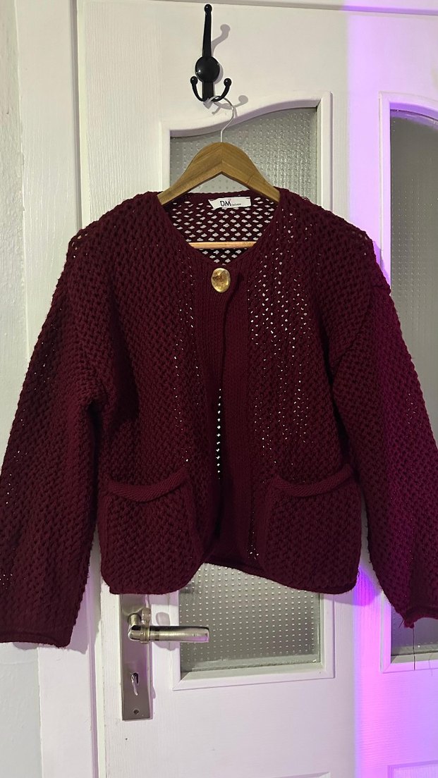 Bordo renkli, örgü kadın hırka, uzun kollu ve notalı yaka detayına sahiptir. Rahat kesimi ve desensiz yapısıyla bohem tarzına uygundur. 2 düğmesi yok onun dışında başka bir sorunu yoktur. temiz üründür.