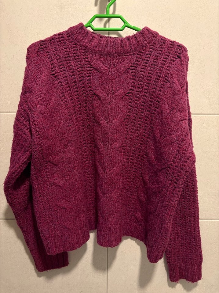 Bordo renkli, örgü dokulu, yuvarlak yaka ve uzun kollu kadın kazak. Rahat ve bol kesimiyle günlük kullanıma uygundur.