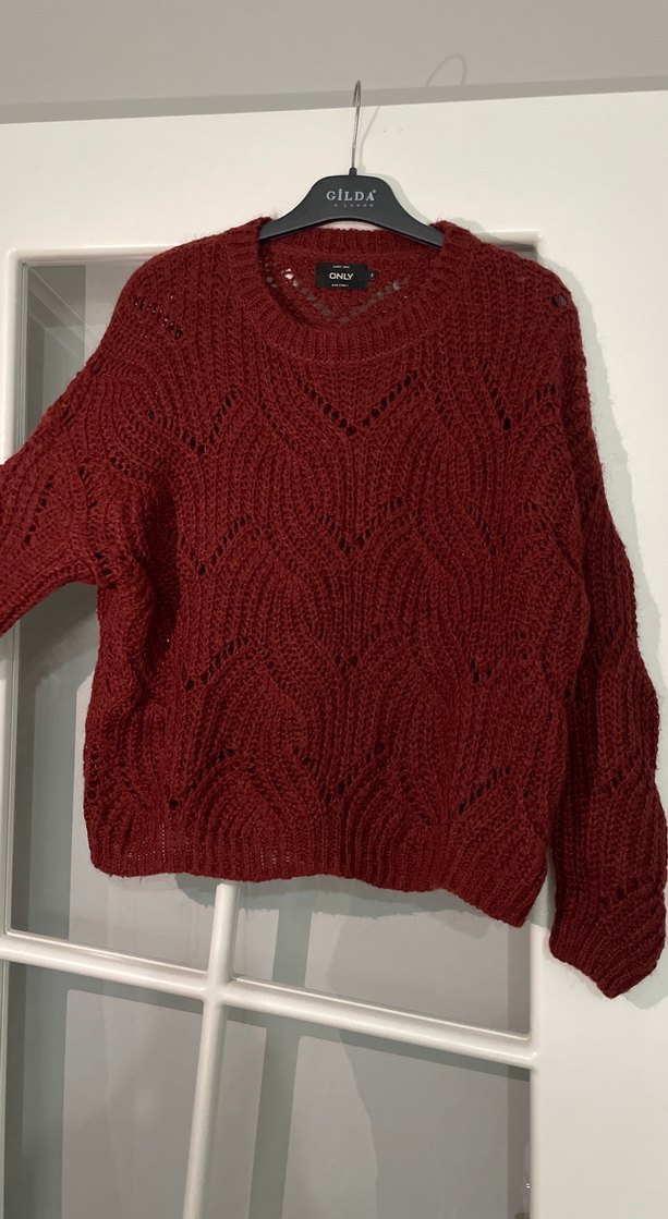Bordo renkli, gevşek kesim, yuvarlak yaka ve uzun kollu örgü kazak, rahat ve bohem tarzda günlük kullanıma uygun.