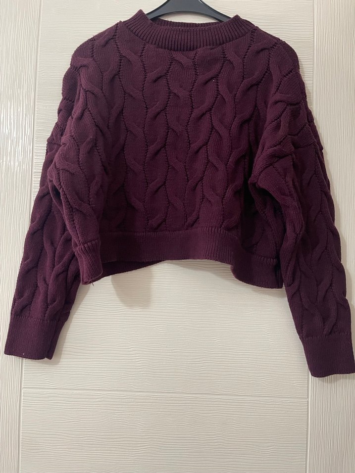 Bordo renkli, örgü kumaştan yapılmış, yuvarlak yakalı ve uzun kollu, bol kesim rahat bir kadın kazağı. Croptur