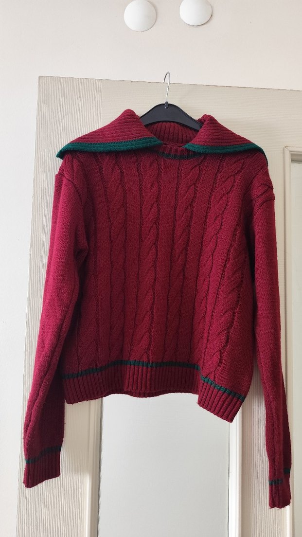 Bordo renkli, örgü kumaştan yapılmış, yüksek yakalı ve uzun kollu, bol kesim kadın kazak. Günlük kullanıma uygun, sade ve rahat bir normcore tarz sunar.