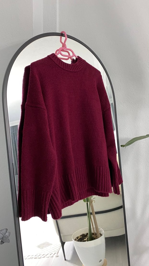 Bordo örgü yün kazak, yuvarlak yaka ve uzun kollu. Rahat, normal boyda ve bol kesimdir. Günlük kullanıma uygundur.